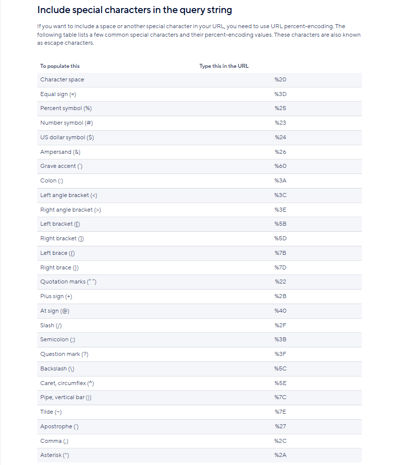 If you want to include a space or another special character in your URL, you need to use URL percent-encoding. The following table lists a few common special characters and their percent-encoding values. These characters are also known as escape characters.