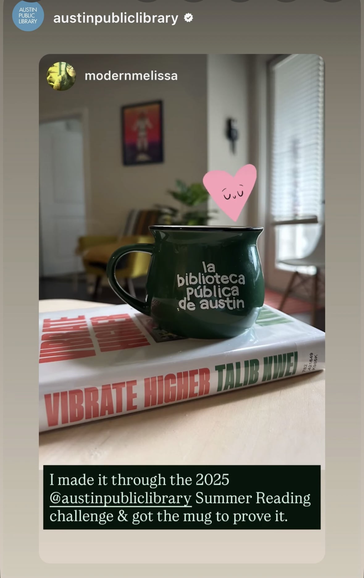 ποΈI am proud to say I have read fourteen (14) books so far AND I beat the summer reading challenge with my local library! Shameless plug (and to show you proof) I am sharing a picture of my social post showing off the "reward" I received for completing the reading challenge. The Austin Public Library reshared my original post on their social handle and I got a ton of comments from the Austin community on my completion!πThe reward is a cool mug that promotes the Austin Public Library, in both English & Spanish, on a nice evergreen coffee mug!