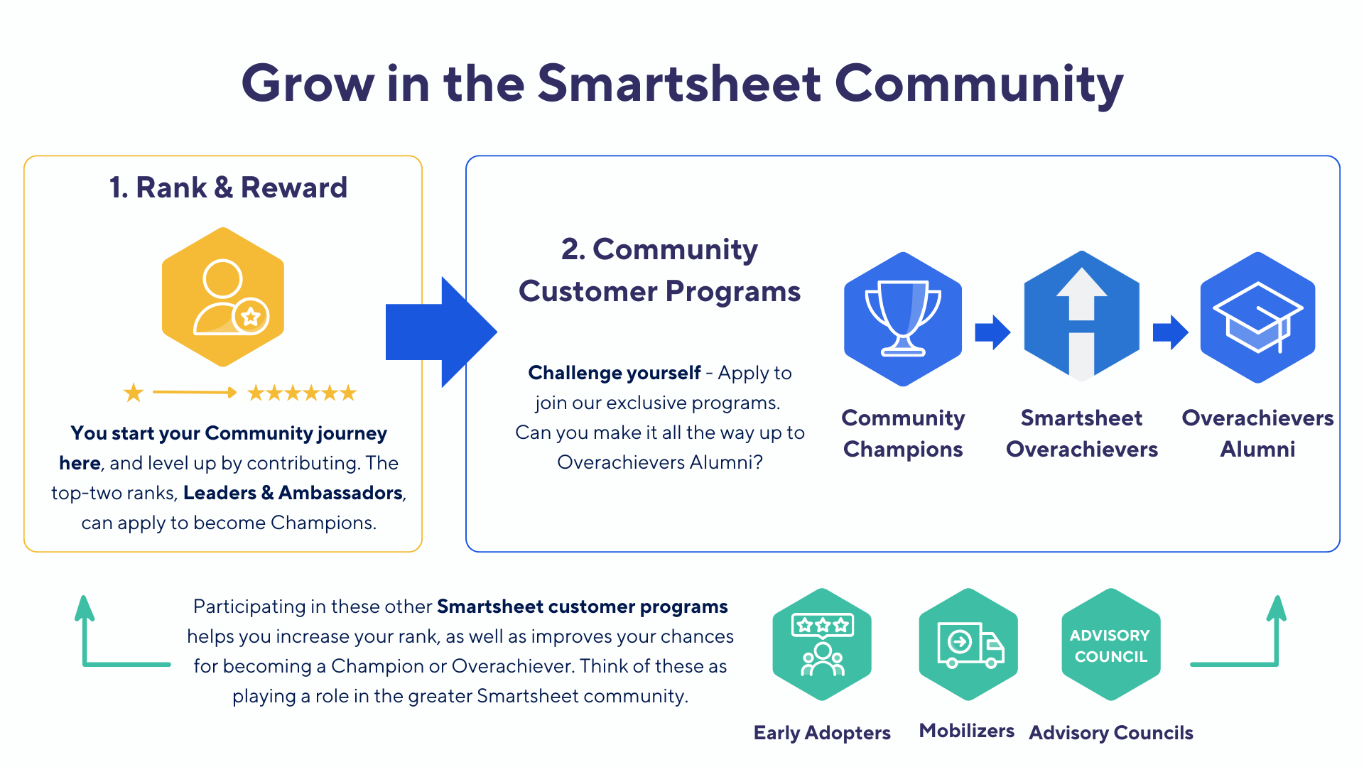 Participating in other Smartsheet customer programs helps to further increase your rank within Community and improves your chances of becoming an Overachiever: