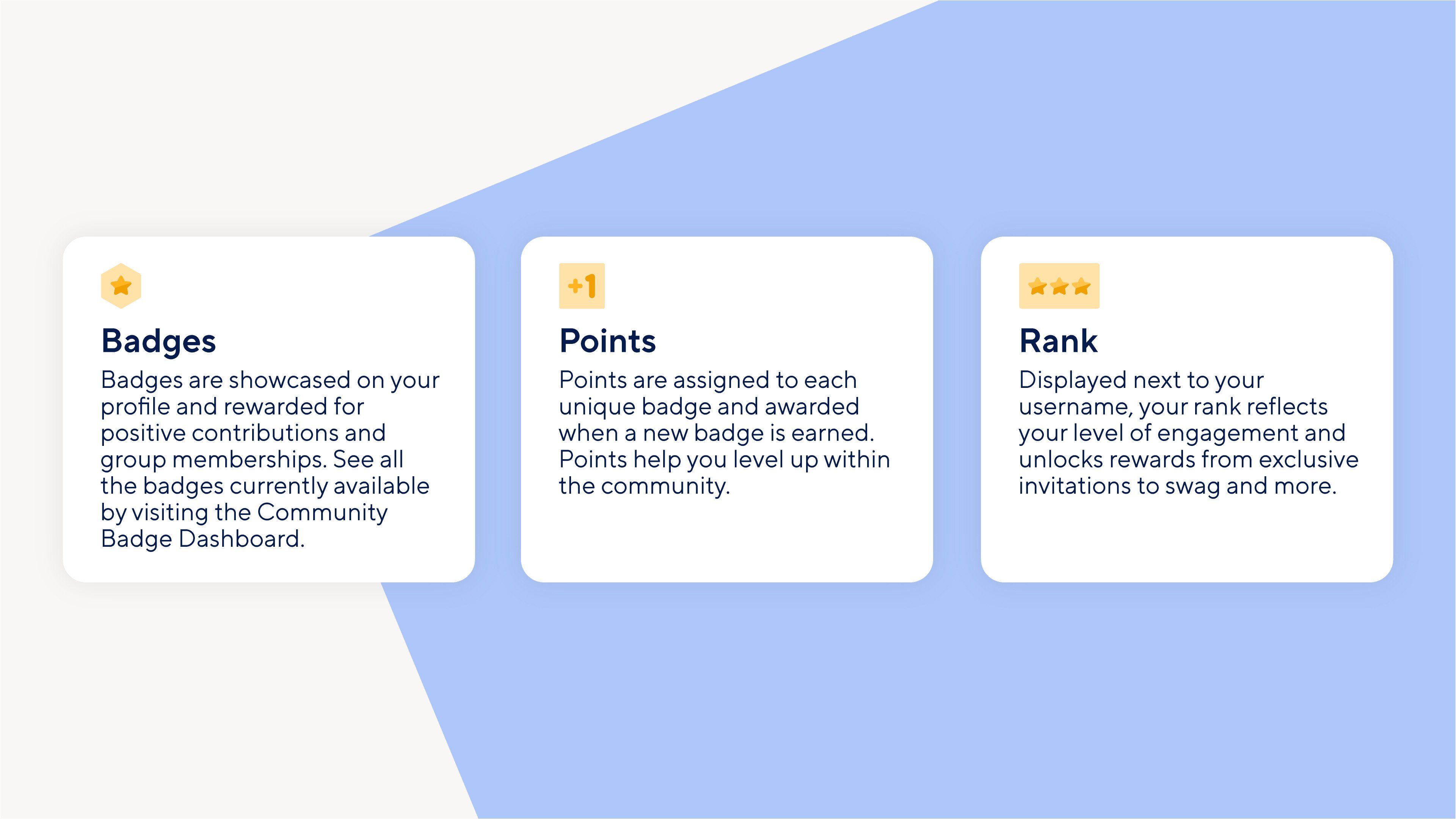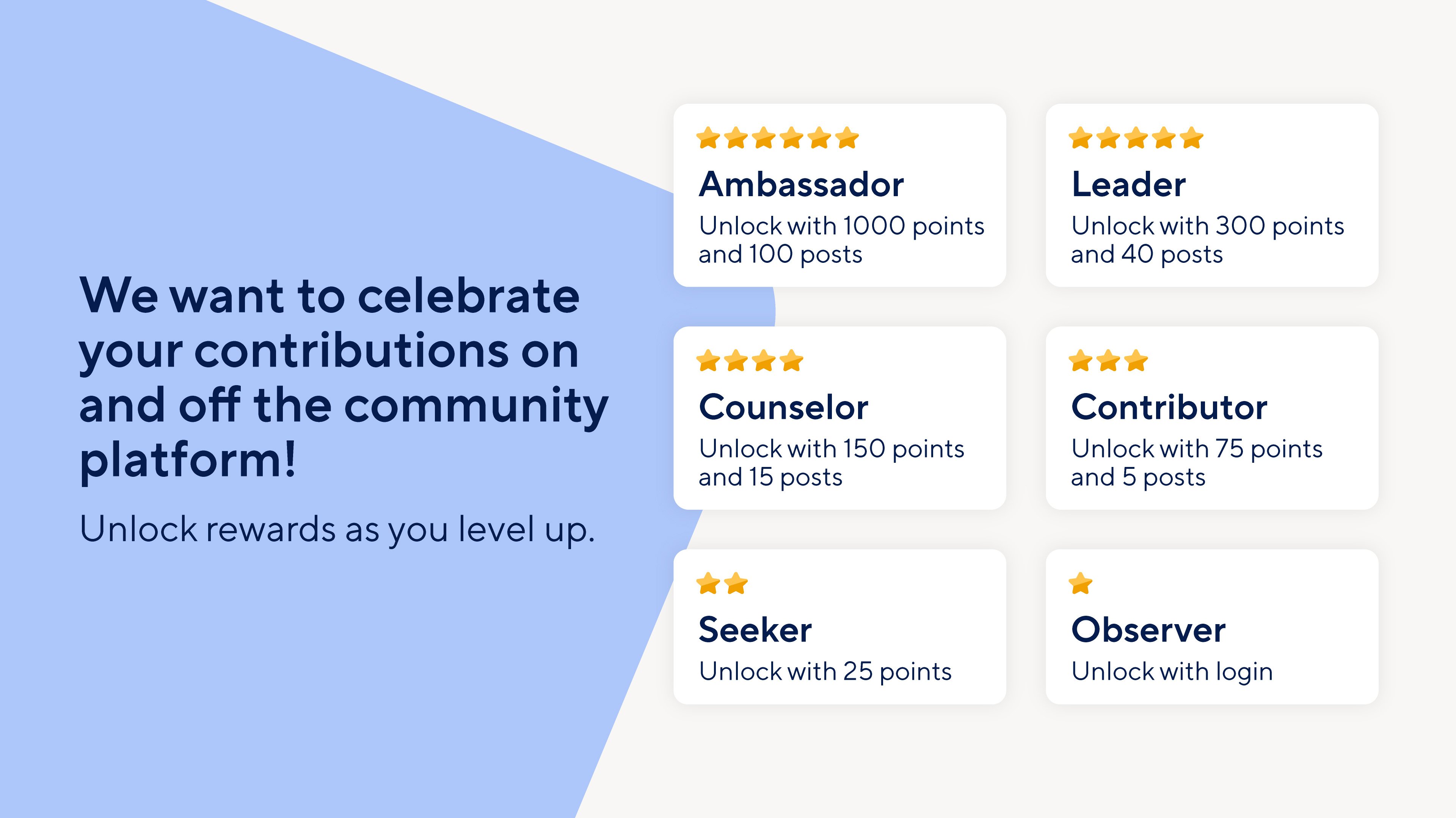 Ready to start growing? You level up within the Community by being an active participant, earning Points and Badges, and reaching key milestones.