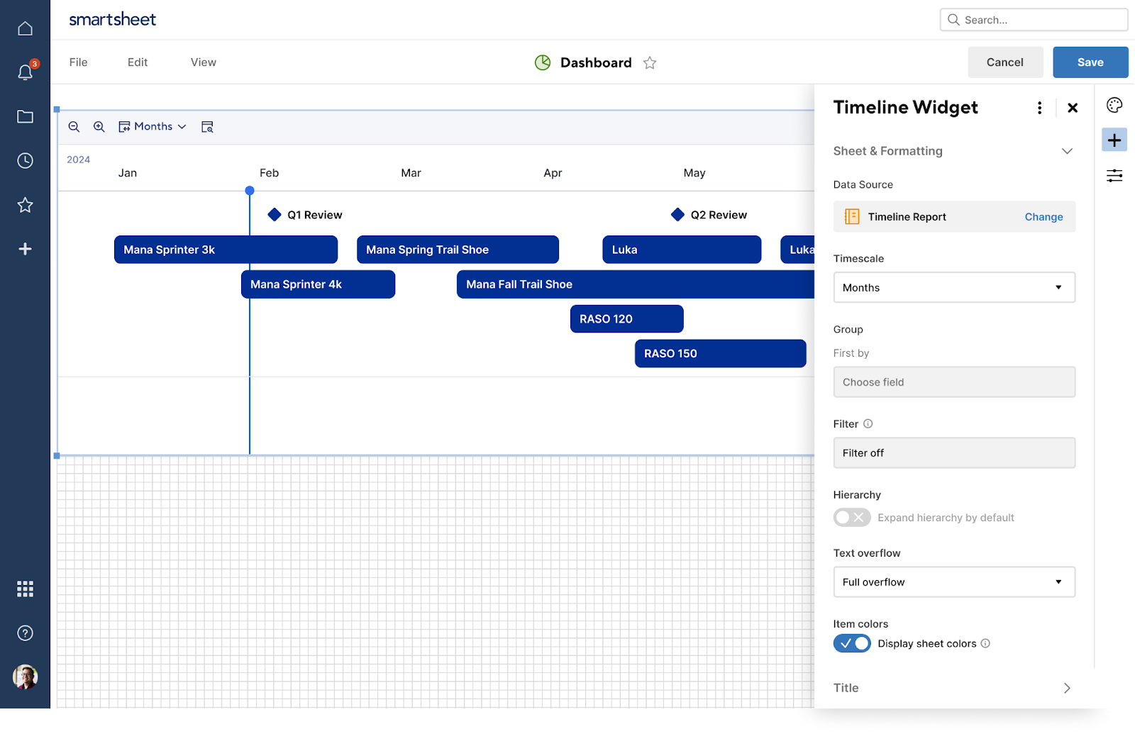 Earlier this year, customers gained the ability to add a timeline view widget to dashboards, but it could only draw from a single sheet. Now, the timeline widget also supports using timeline reports as a data source, allowing teams to surface timelines built from multiple sheets or projects. Learn More