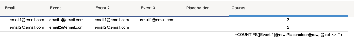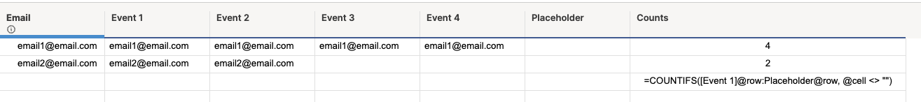 @RAdamowicz You may be able to simplify this just a little bit more. If all event columns are next to each other, you can insert a placeholder column at the end and use a COUNTIFS from the first even to the placeholder column. Any columns added in between (new events) would automatically be included in the COUNTIFS, so you wouldn't have to keep updating your formula every time you added a new event.