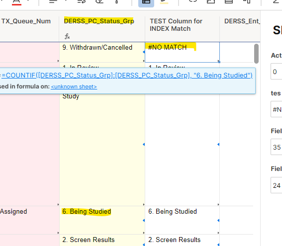 There is a column that is using a VLOOKUP formula to return an expression in my sheet. I'm trying to create a formula to count the number of Active Studys ("6. Being Studied") in this column, but I keep getting back, #NO MATCH, even though there ARE cells with that expression.