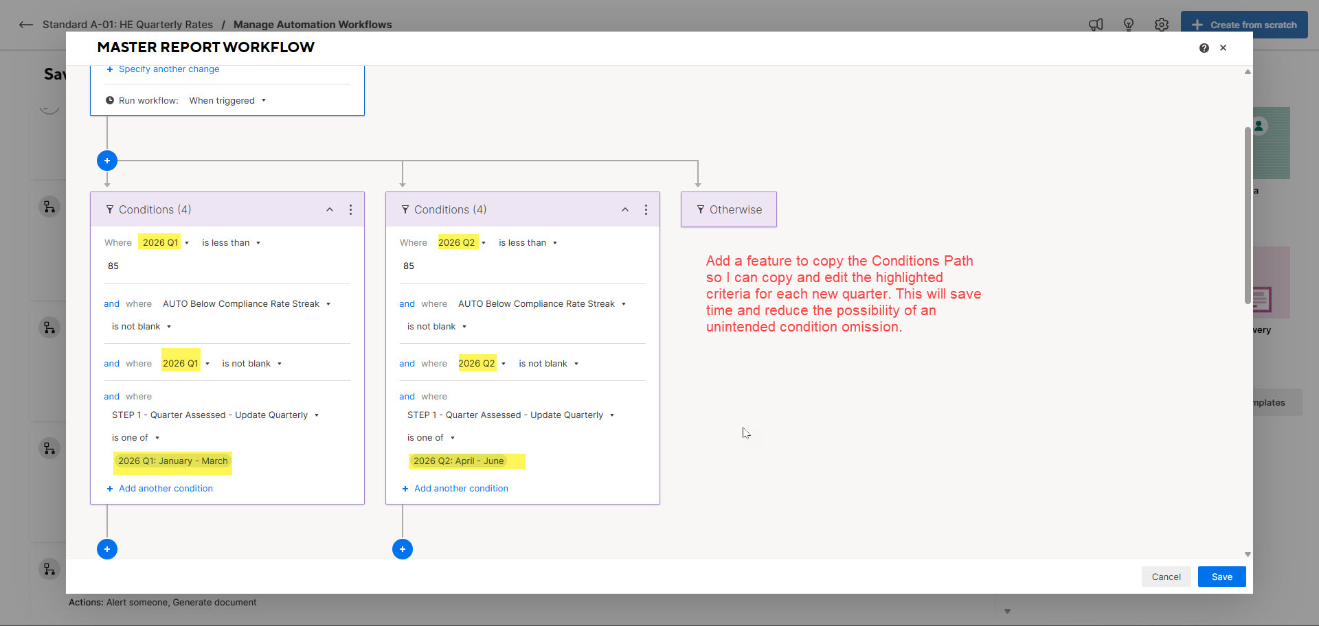 Currently when building a workflow, if you need to create more than one condition path but only 1 or two criteria out of several are different in each condition path, you have to recreate each condition path from scratch. This can get very time consuming if you need multiple condition paths. Could a function be added on the condition path that allows you to duplicate it so you can just change the criteria you need to change and not have to build from scratch? This would be similar to the "Duplicate" function present on the whole workflow, except you could duplicate a condition path within a workflow.