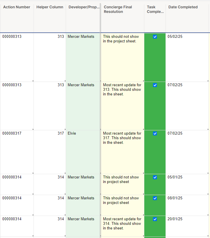 I want to latest comment from the 6/2 in the Concierge Final Resolution column to show in the partner sheet for project/action number 000000312 (Project 1)