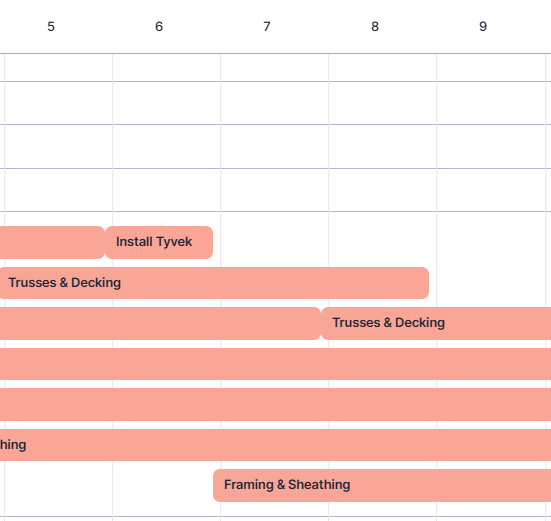 Working with a multi-family developer building multiple apartment buildings on the same project. Trying to get in front of bottlenecks in the schedule where we're expecting multiple crews in multiple buildings and end up short staffing or over staffing. For instance, Row 58 the Framer should be starting Task "Wall Framing" on 7/14/25.