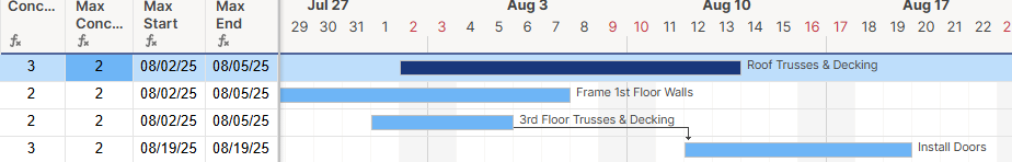 I would like a formula in the Grid View to fill the "Maximum Concurrent Tasks" cell to return a value of "3" in this instance. That way I can conditionally format to call out when our schedule is overallocated. For instance in the following clip my schedule is calling for 6 crews to be on site for a stretch.