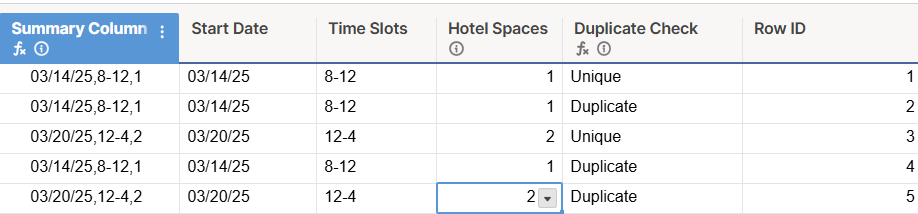After much research, I am still stumped.  I have set up a Smartsheet that will allow users, via a form, request a date and time slot for hoteling (work desk reservation).  I have a link in the form to the dashboard so they can look at the calendar to see if there is availability.  I am sure some will not look at the calendar and submit the request.  I find the duplicates with a helper column combining the date, time slot, and desk number under the column name Dup Compare