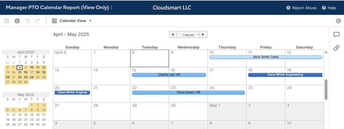 I would like to have one report for the managers to show Name, Division, Start, End, and Approved. I want it to color code by Division so each manager has a view of all divisions but can pick theirs out at a glance. Also it would be viewed in Calendar View with each entry titled in the format of "Name - Division". Unapproved requests would be filtered out of this report.