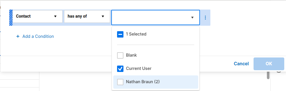 I'm trying to create a report using the 'Current User' filter feature. However, when I attempt to setup the filter in the report that I just created, there's No Dropdown for the 'Enter Value' cell. I just get a text box. Also, the 'Enter Value' text box has a red outline prior to attempting to type something. Nothing happens when I double click in the text box & I see no way to modify the action…it only allows me to type text…no dropdown.