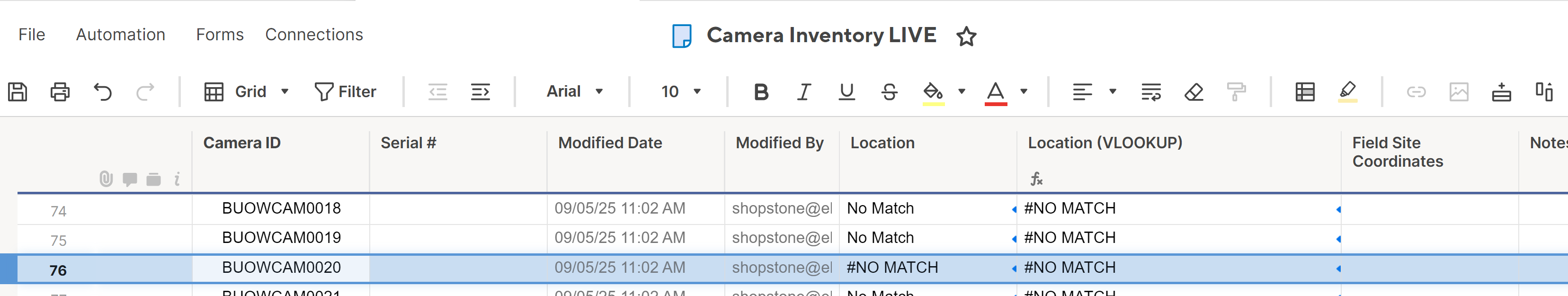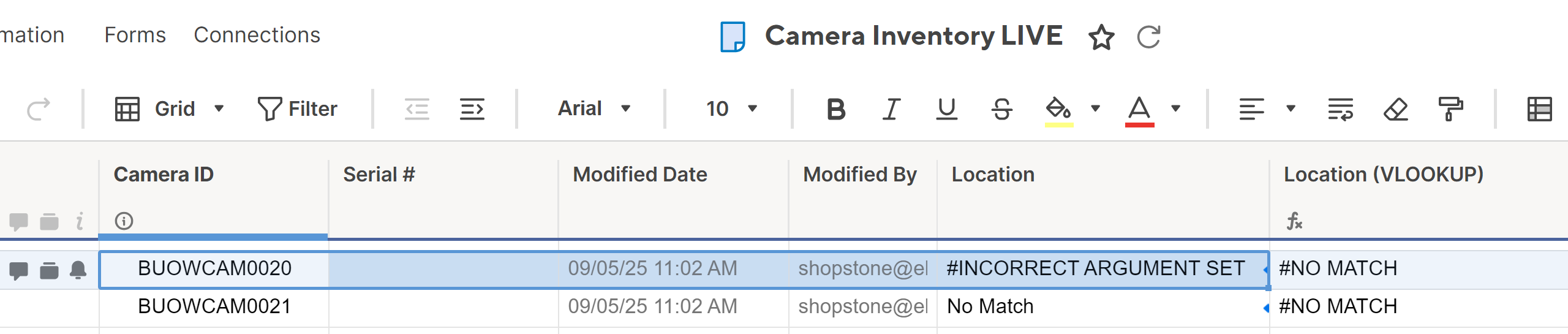 =IF(CONTAINS([Camera ID]@row , {Camera Inventory Ledger: Camera ID Ref}), VLOOKUP([Camera ID]@row , {Camera Inventory Ledger: Camera ID + Location}, 2, false), "No Match")