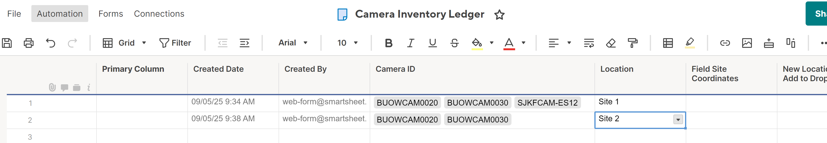 Part 1: Ledger grid. Each day, when end users drop off a set of cameras, they fill out a Form, select the camera IDs from a dropdown list, and enter the dropoff location. These Form entries fill up the Ledger.