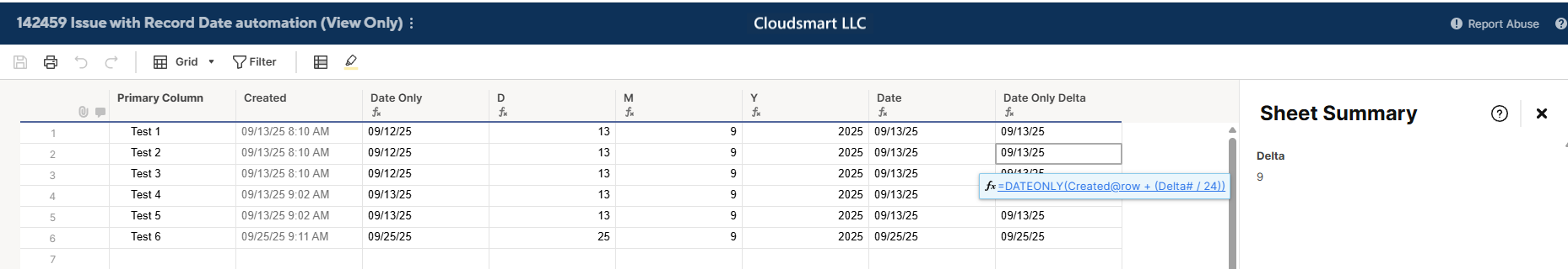 Originally, I used =DATEONLY(Created@row ) to capture the form submission date. But that formula had the same problem — submissions close to midnight often rolled to the next day. Smartsheet Support previously recommended creating a helper column and using a “Record a Date” automation triggered on form submission. That worked reliably for years, even for late-night submissions.