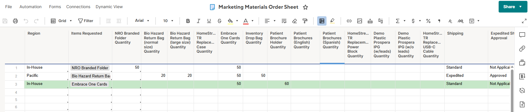 I have one sheet that is where we will manage the "orders submitted" and on that sheet is different columns for different items that can be ordered and the quantities requested for each item.