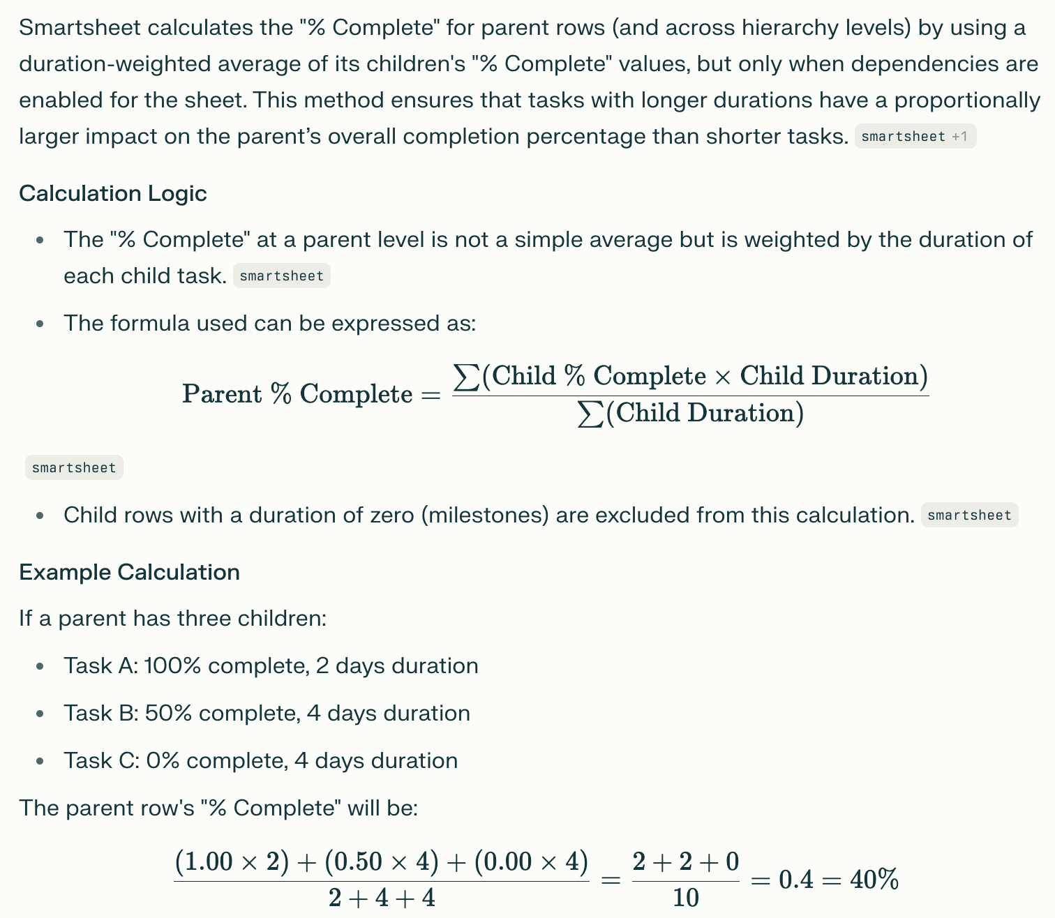 Despite these calculations, the parent task in Smartsheet shows a different % Complete value. Could someone provide clarity on the methodology or formulas Smartsheet uses for these calculations? Understanding the exact algorithm or approach would greatly aid in aligning manual calculations with those generated by the platform.