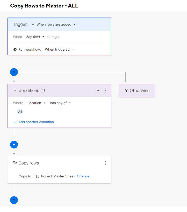 I'm using a form entry (into an Intake Sheet) in which someone can select multiple locations for the same Initiative. I'm looking to copy the row to a different Master sheet, but would like to have the same row copied multiple times, once per location selected.