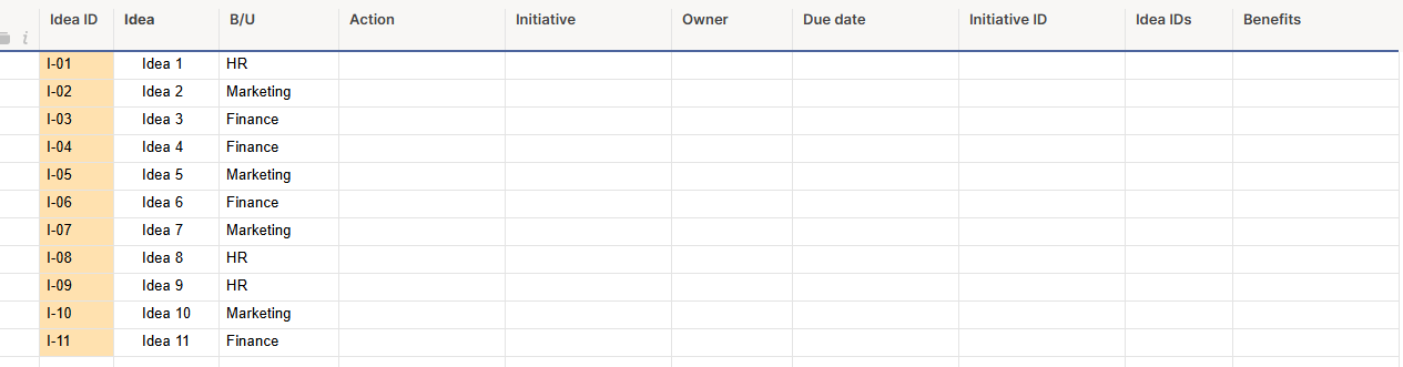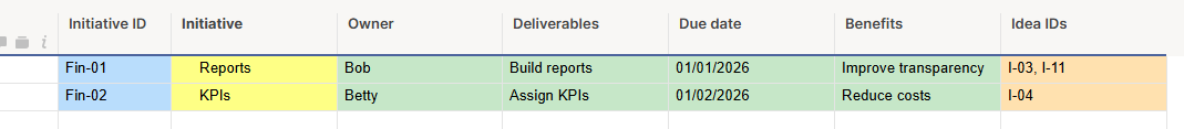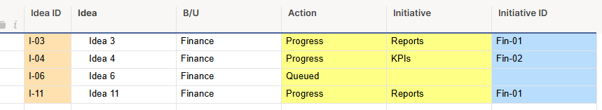 - Auto-populating (through a formula) the "Idea IDs" column with the IDs of the ideas associated with that initiative.