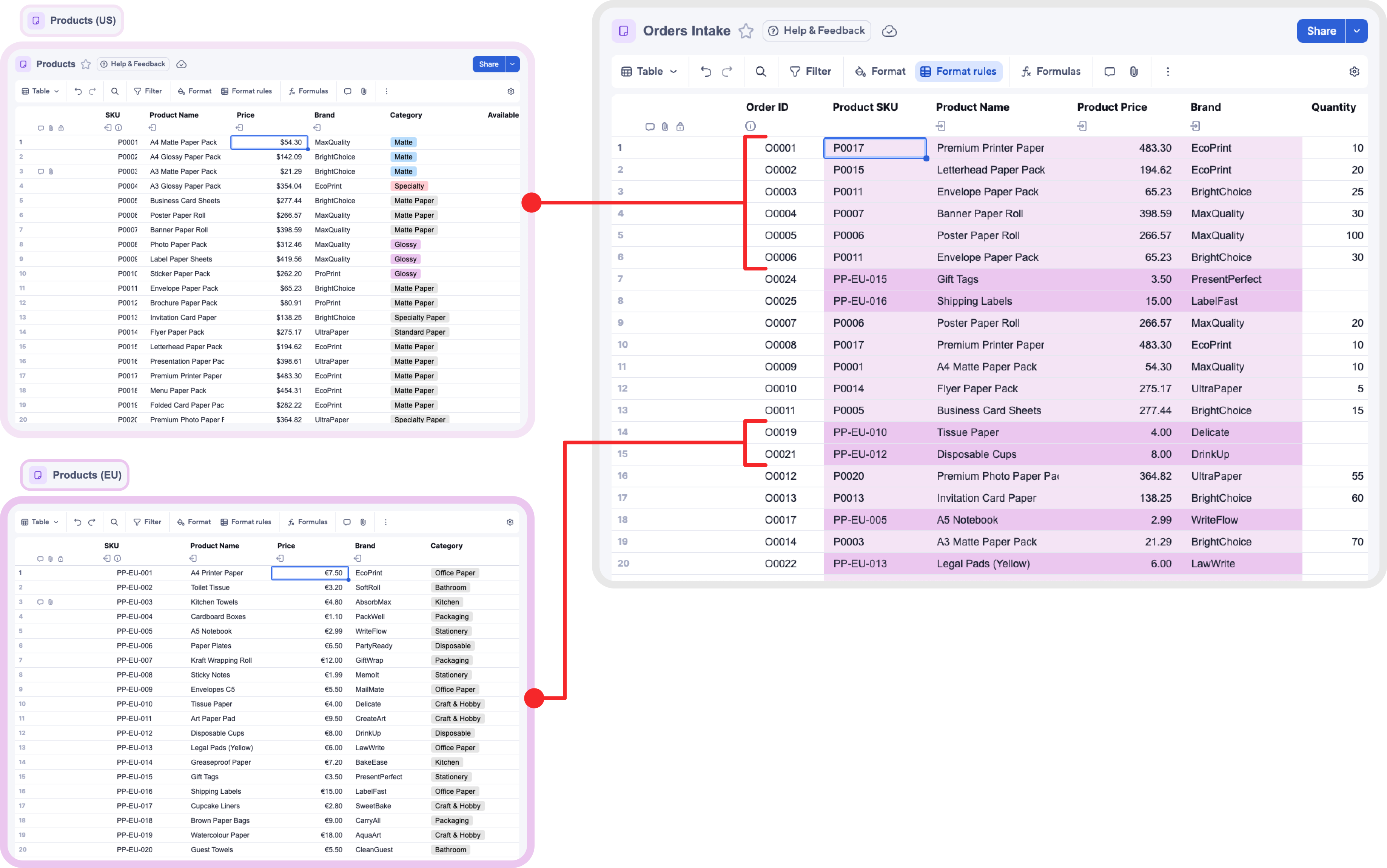With this release, you can now use multiple sheets as sources for the same columns in column link configurations. For example, if you are looking up product data, you can match unique identifiers on a target sheet against a maximum of 10 different source sheets by building a column link configuration per source sheet.