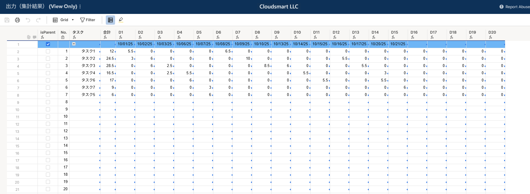 ・各タスクの稼働実績を集計したい・さらに日ごとの合計(全タスク合計)を出したい