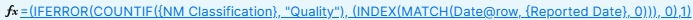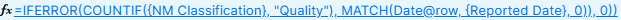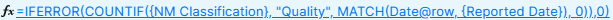 I'm working on a formula that will return a count based on a matching dates and the word "Quality", but I'm getting the unparseable error.