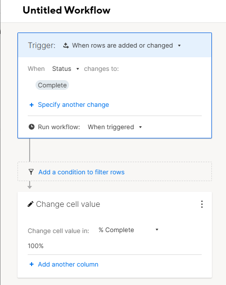 I have an automation set up so that when the Status column changes to Complete, Canceled, or Not Needed, Smartsheet automatically updates the % Complete column to 100% (Text/Number column type). After that, another workflow should trigger to alert the next person that their task is ready.