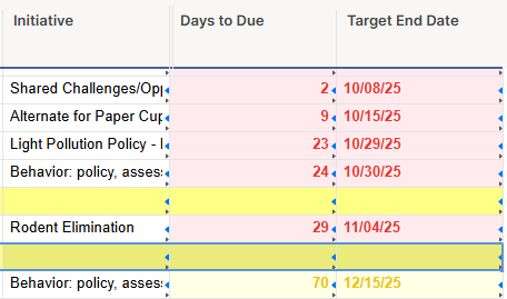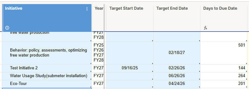 Desired result is to pull the Initiative Name where the Days to Due Date is the least (so, due the soonest); then to make an index for the Top 10 Initiatives Due Soonest