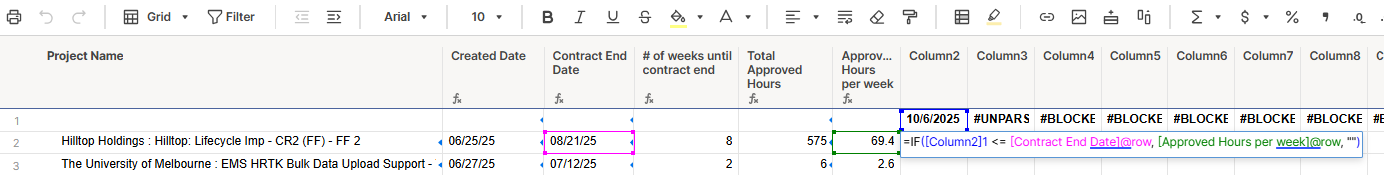 =IF([Column2]1 <= [Contract End Date]@row , [Approved Hours per week]@row , "")