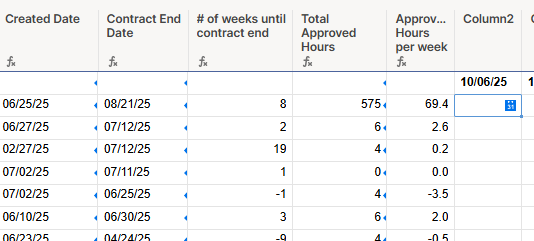 I've calculated the difference between created date and contract end date in the # of weeks until contract end" column. Then I did a vlookup for the "total approved hours" (from our governance approval sheet) and divided the total hours by the # of weeks" column value to get "Approved hours/week" column values.