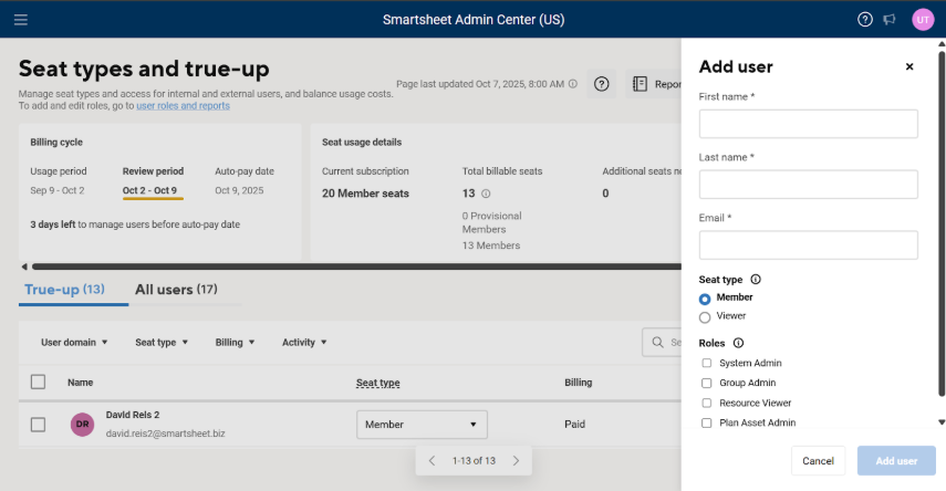 System Admins can now add users on the seat types and true-up page in Admin Center. This new feature saves System Admins time by enabling them to add individual users directly on the seat management page as well as add users in bulk via file upload. Users can be assigned paid Member or free Viewer seat types when added. Learn More.