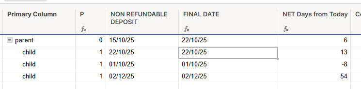 Ok hive mind - I haven't been able to talk this formula out with someone yet, so I am looking for a little help. I have the formula that will fill out the children of my FINAL DATE column, but to fill out the parent row, I want my formula to look at the children of the NON REFUNDABLE DEPOSIT column, and tell me what is the next closest upcoming date in the future. Help!!