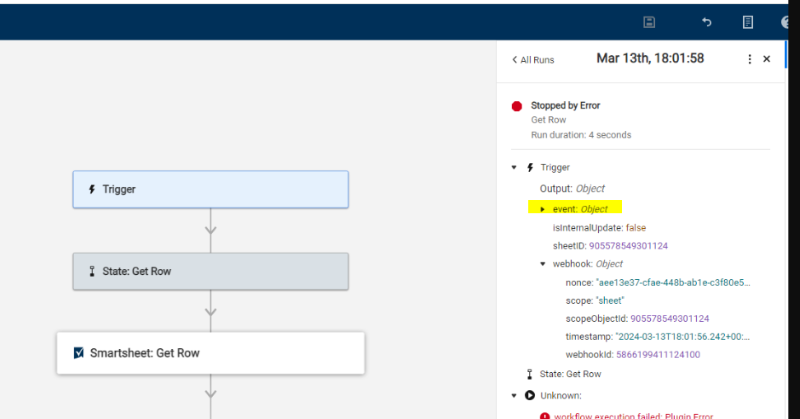 I've completed the authentication process, created a trigger and made sure that the trigger has the right source sheet and event type but I am noticing that I can't get any data from the trigger. My goal is to get the row information when new row is added in my sheet so I can copy some of the data over to another sheet. See below :