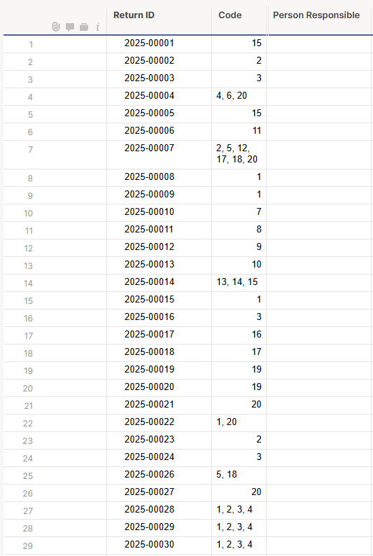 I want to bring the resulting person(s) responsible for each code to the collection table into one cell (Person Responsible column).
