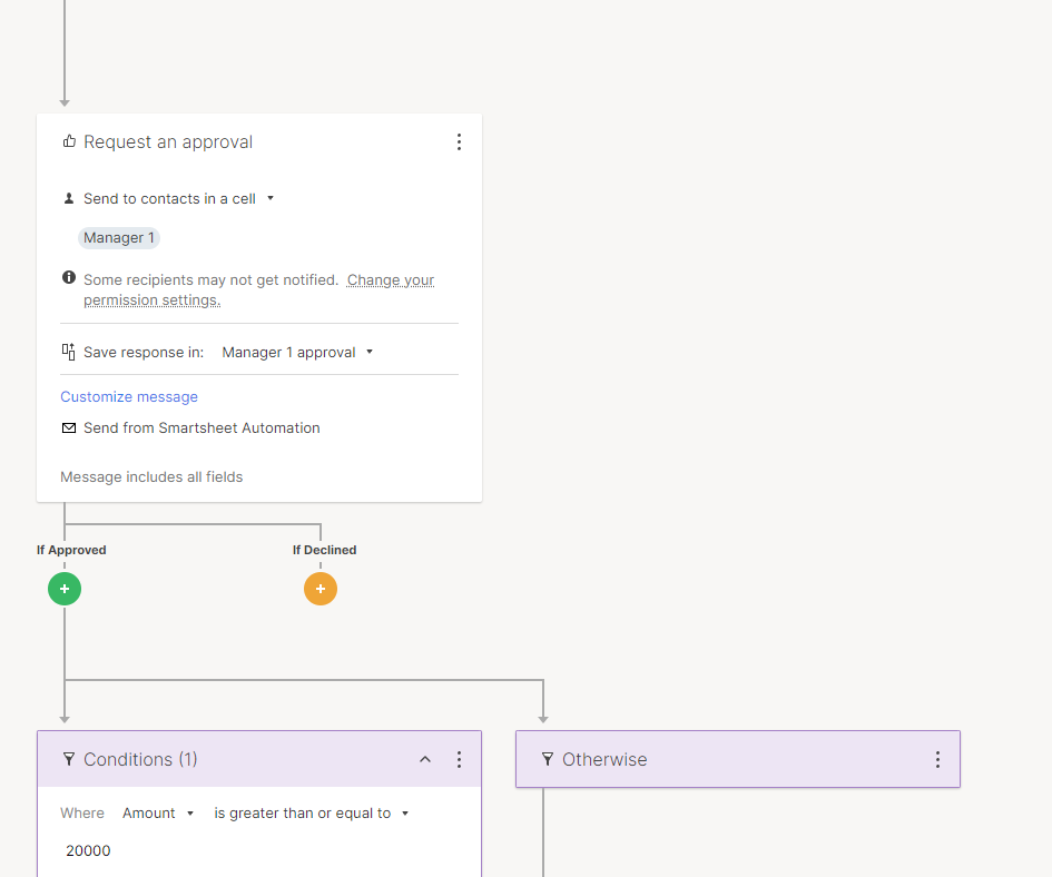 Condition 1 : When amount below 20,000 and Manager 1 Approve, then Requester can approve