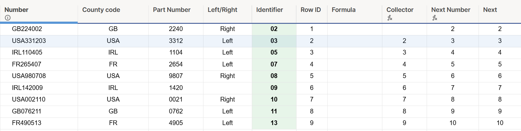 =IFERROR(INDEX(COLLECT([Next Number]:[Next Number], [Row ID]:[Row ID], [Row ID]:[Row ID] = [Row ID]@row - 1), 1), "")
