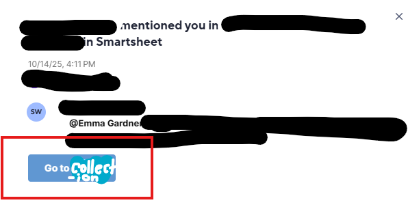 When utilizing the comments function from a collection and mentioning another user, the notifying message/notification has the "go to sheet" button to easily view and reference the row where the comment was added. The problem is that link takes them to the base sheet external to the collection, so the can't easily access.