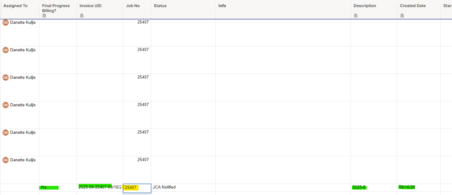 See below a row that was populated, filtering on Job No, but the field now contains " ' " before the number. Green is the info that is populated by the table. Notice that I have the Assigned to column pre-populated in rows above, but that contact is now missing from the row that was populated by the table. Not shown are 3 formulas in other columns that are now missing, as well.