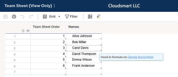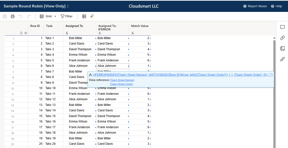 The AI formula showed: =IFERROR(INDEX({Team Sheet Names}, MATCH(MOD([Row ID]@row , MAX({Team Sheet Order})) + 1, {Team Sheet Order}, 0)))