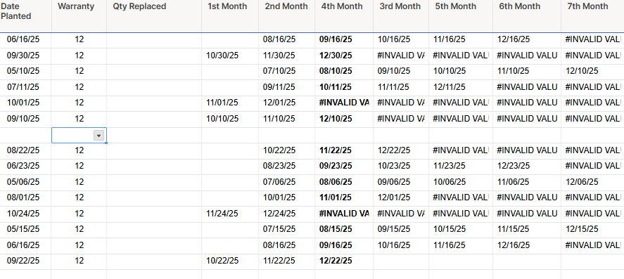 I want to put a date in columns that are monthly increments off an entered date field. We want to have reminders when a site needs to be reviewed for warranty items. This is based off 'Planted Date'. I created 12 columns for each month we need to visit the site. I was able to enter the following formula and it works till it needs to roll over to 2026. I've tried +1 after the year but it did not work. Any help would be greatly appreciated.