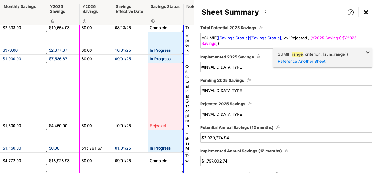 Sheet Summary (for Dashboard) formulas broke returning "INVALID DATA TYPE".