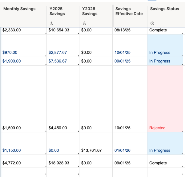 Today we added a Y2026 Savings column to our sheet. Column formulas were all updated as well to look for values with "effective dates" in their corresponding years.