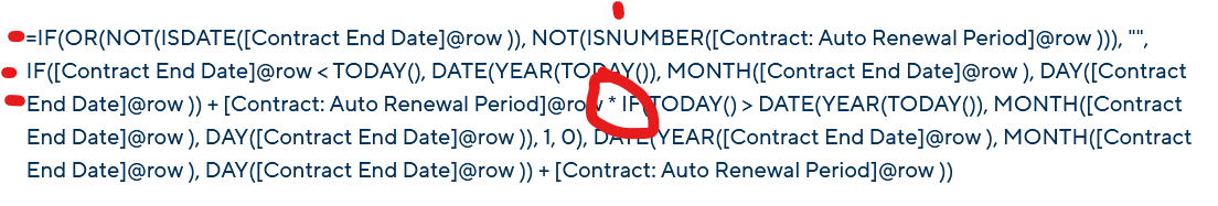 =IF(OR(NOT(ISDATE([Contract End Date]@row )), NOT(ISNUMBER([Contract: Auto Renewal Period]@row ))), "", IF([Contract End Date]@row < TODAY(), DATE(YEAR(TODAY()), MONTH([Contract End Date]@row ), DAY([Contract End Date]@row )) + [Contract: Auto Renewal Period]@row * IF(TODAY() > DATE(YEAR(TODAY()), MONTH([Contract End Date]@row ), DAY([Contract End Date]@row )), 1, 0), DATE(YEAR([Contract End Date]@row ), MONTH([Contract End Date]@row ), DAY([Contract End Date]@row )) + [Contract: Auto Renewal Period]@row ))