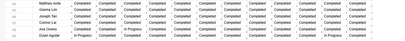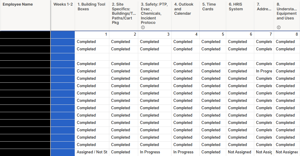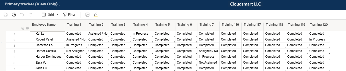 The primary tracker has approximately 107 columns, each column represents technical training. We will use this one to provide overall statistics and for the trainer to update status.