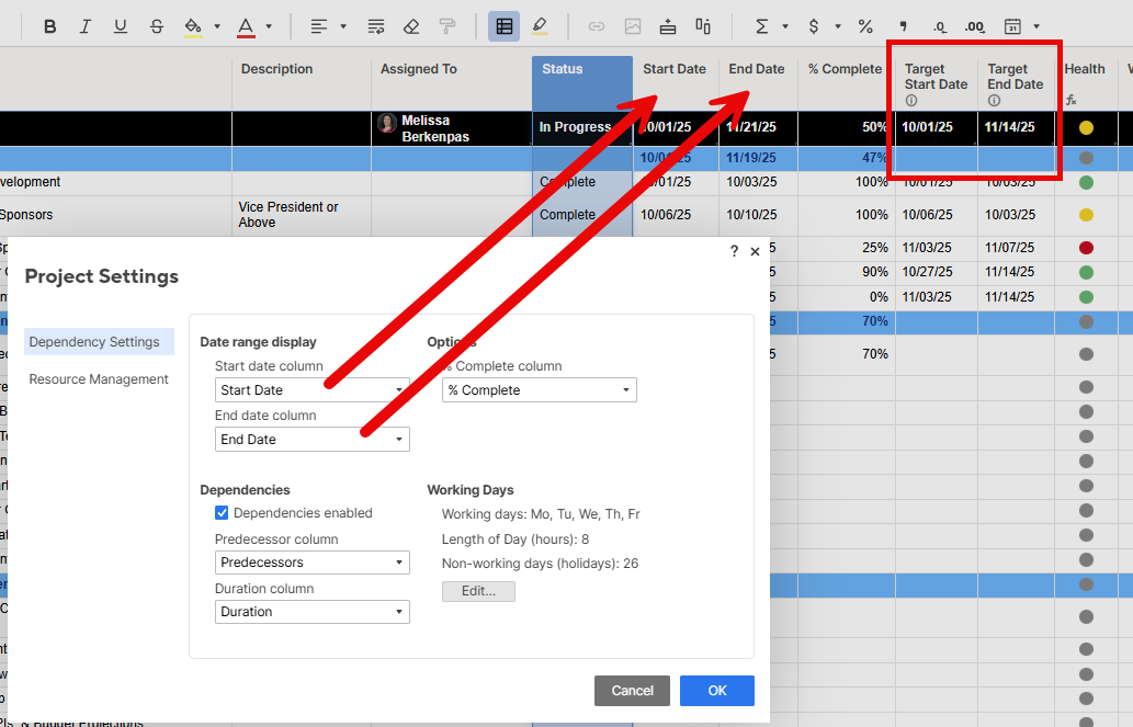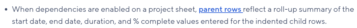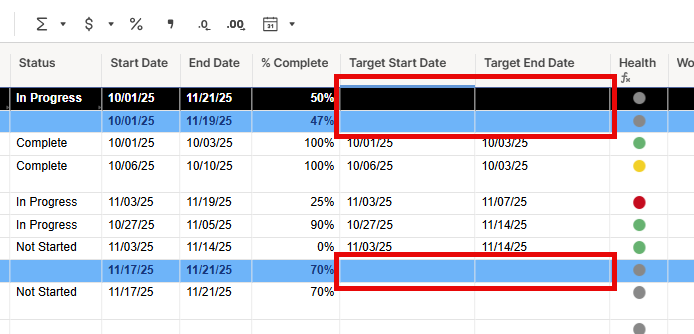 I would like to have target start/end date columns that work exactly like the default Start Date & End Date columns, meaning I want the parent rows to populate based on the smallest date in the start column and the largest date in the end column.
