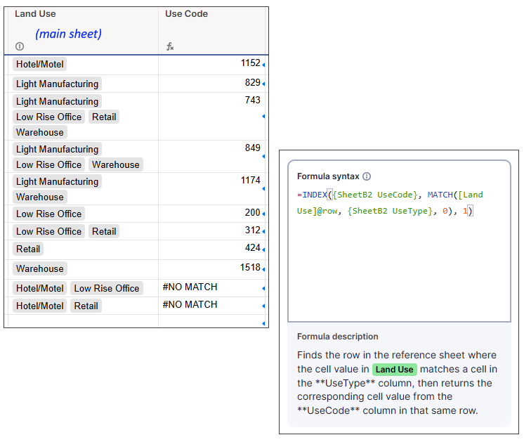 =IF(AND(HAS([Use Type]@row , "Light Manufacturing"), HAS([Use Type]@row , "Warehouse")), "1174")