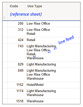 =IF([Use Type]@row = "Retail", "424", IF([Use Type]@row = "Low Rise Office", "200", IF([Use Type]@row = "Hotel/Motel", "1152", IF([Use Type]@row = "Light Manufacturing", "829", IF([Use Type]@row = "Warehouse", "1174", IF([Use Type]@row = "Retail/Office Mix", "312", IF([Use Type]@row = "Light Man/Warehouse Mix", "1174", IF([Use Type]@row = "Light Man/WH/Office Mix", "849", IF([Use Type]@row = "LM/WH/Office/Retail Mix", "743")))))))))