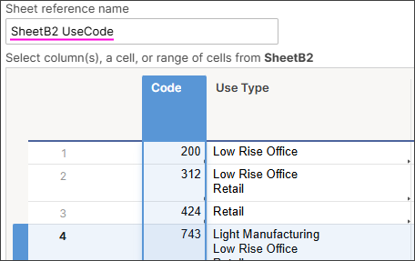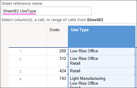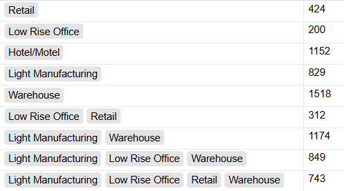 =IF(AND(HAS([Use Type]@row , "Light Manufacturing"), HAS([Use Type]@row , "Warehouse"), HAS([Use Type]@row , "Low Rise Office"), HAS([Use Type]@row , "Retail")), "743")
