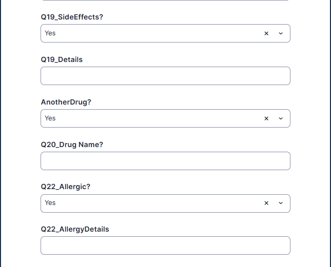 I am building a form with a repeating feature for study drugs. The form includes 10 questions about the first drug, with branching logic in 2 of those questions. If the answer is YES, a text field appears for more information. This works fine for the first drug. The last question asks if there is another drug. If the answer is YES, the same 10 questions appear for the second drug. However, the branching logic for the repeated questions does not work. The fields that should only appear when the answer is YES always appear, even when the answer is NO or the question has not been asked. I have tested the branching logic on a single instance of the form, and it works as expected. The issue seems to occur only when the questions are repeated.