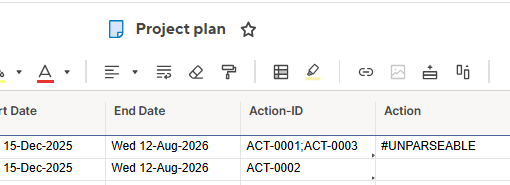 In my project plan sheet, I have a column called RiskID that contains a string of risks (ACT-001; ACT-0002; etc.) linked to a task. The risks are separated by semi-colon, how can I inform the risk sheet that the risk row is linked to a task in the project plan.