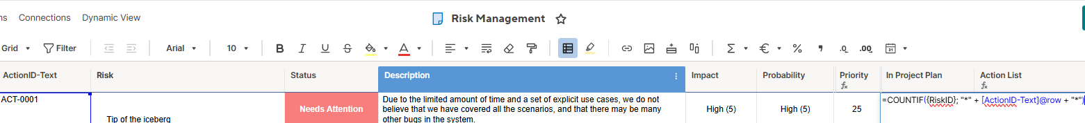 I have a risk sheet with a system generated id column (ACT-0001); etc. In the risk sheet I have a helper column to identify if the risk is linked to a task in my project plan sheet.
