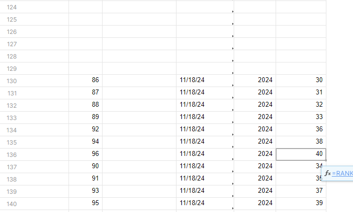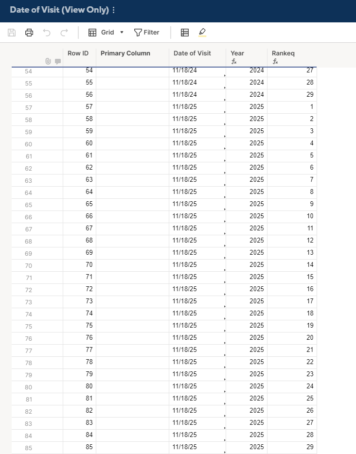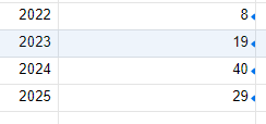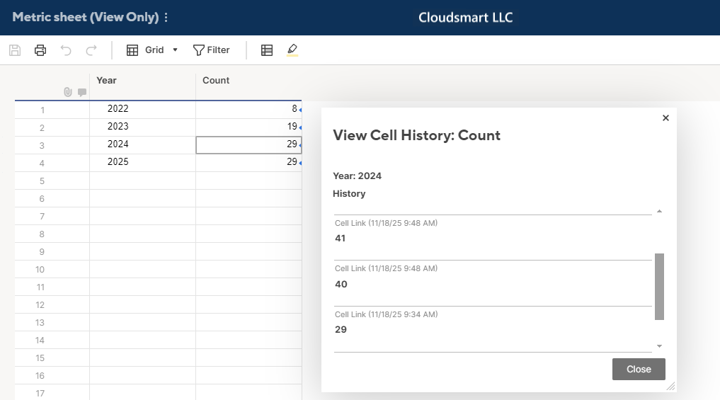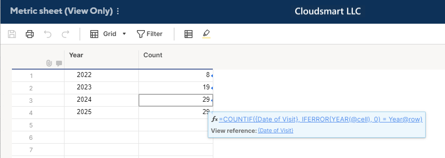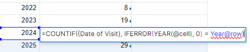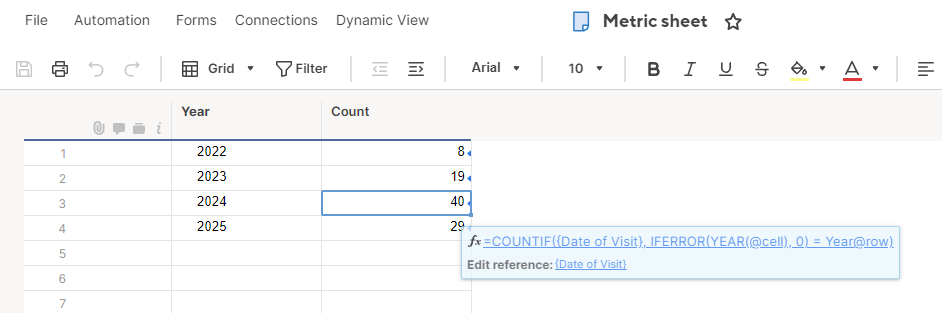 I have created a metric sheet that was then used to create a chart. The formula is written as: =COUNTIF({Date of Visit}, IFERROR(YEAR(@cell ), 0) = Year@row ) This was then drug down for 4 rows. Rows 1, 2, and 4 have the correct total. Row 3 is giving a total of 40 and it should also be 29.